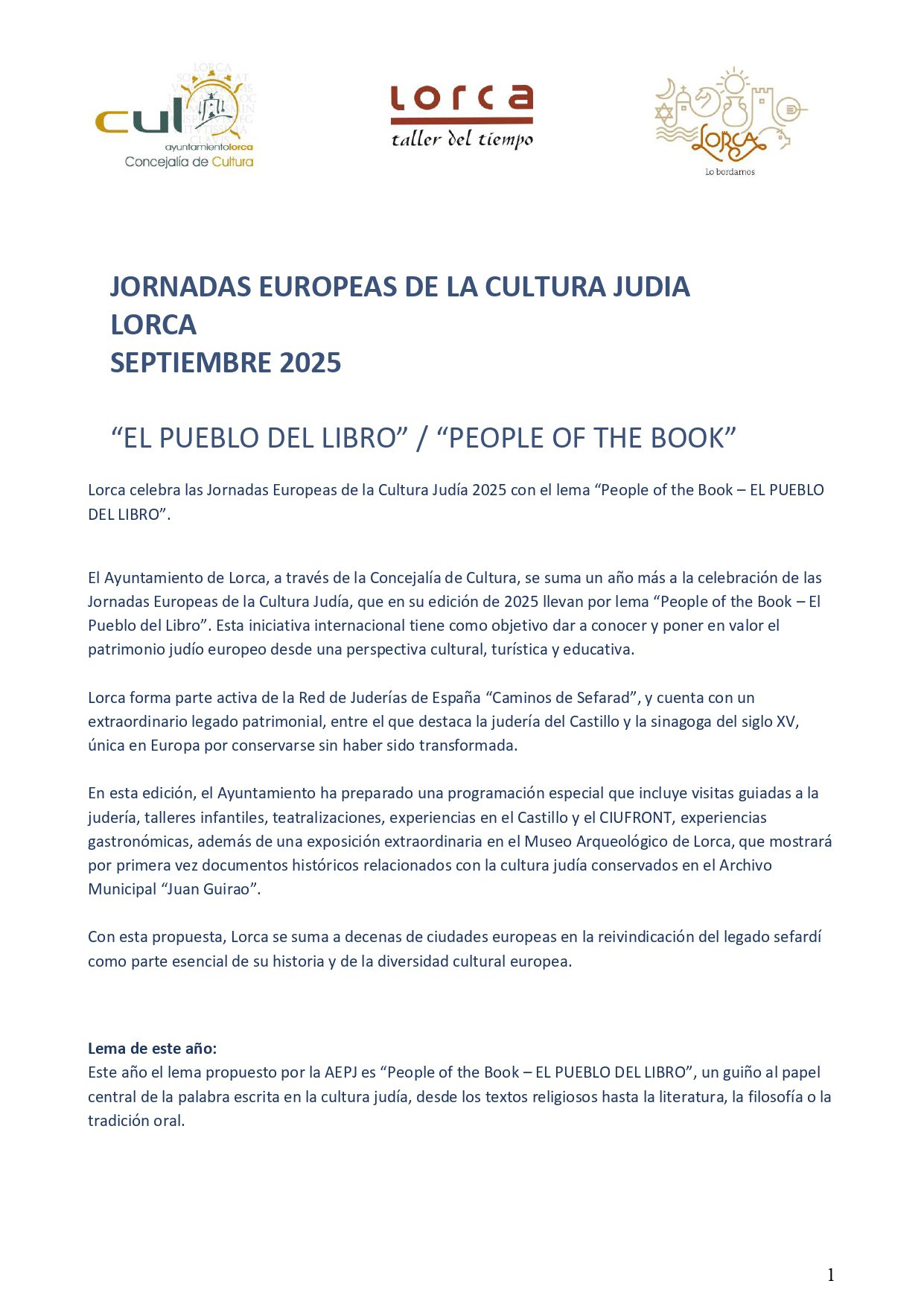 Del 1 al 30 de septiembre de 2024 Lorca celebra las 25º Jornadas Europeas de la Cultura Judía con diversas actividades para toda la familia.