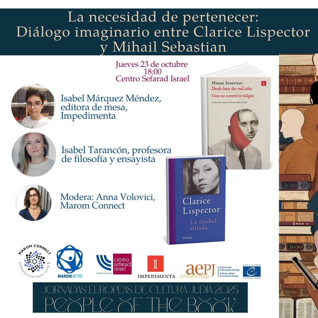 En el marco de las Jornadas Europeas de la Cultura Judía, dedicadas este año al tema El Pueblo del Libro, Marom Connect —plataforma cultural que difunde y conecta proyectos vinculados al judaísmo en español—, en colaboración con la AEPJ (European Association for the Preservation and Promotion of Jewish Culture and Heritage), invita a una tarde literaria en torno a dos autores esenciales: Mihail Sebastian y Clarice Lispector.