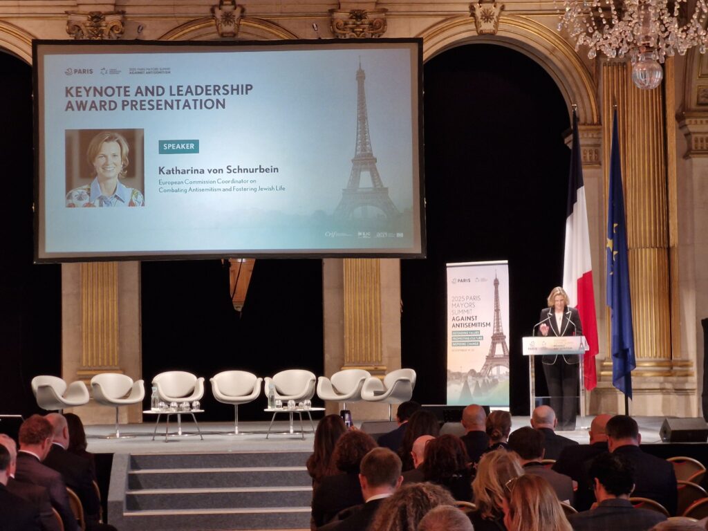 The Summit brought together mayors, municipal leaders, policymakers, researchers and civil society organisations from across Europe and beyond for a full day of high-level dialogue. The programme opened with remarks by Anne Hidalgo, who reaffirmed the city’s longstanding commitment to combating antisemitism, followed by interventions from leading figures including Yonathan Arfi, President of CRIF, and Moshe Kantor, President of the European Jewish Congress. A highlight of the opening session was the address by Katharina von Schnurbein, the European Commission Coordinator on Combating Antisemitism and Fostering Jewish Life, who received the Summit’s Leadership Award in recognition of her work developing the EU Strategy on combating antisemitism. Her remarks underscored the need for coordinated European, national and local action and emphasised the essential role of municipalities in implementing the EU Strategy on the ground.