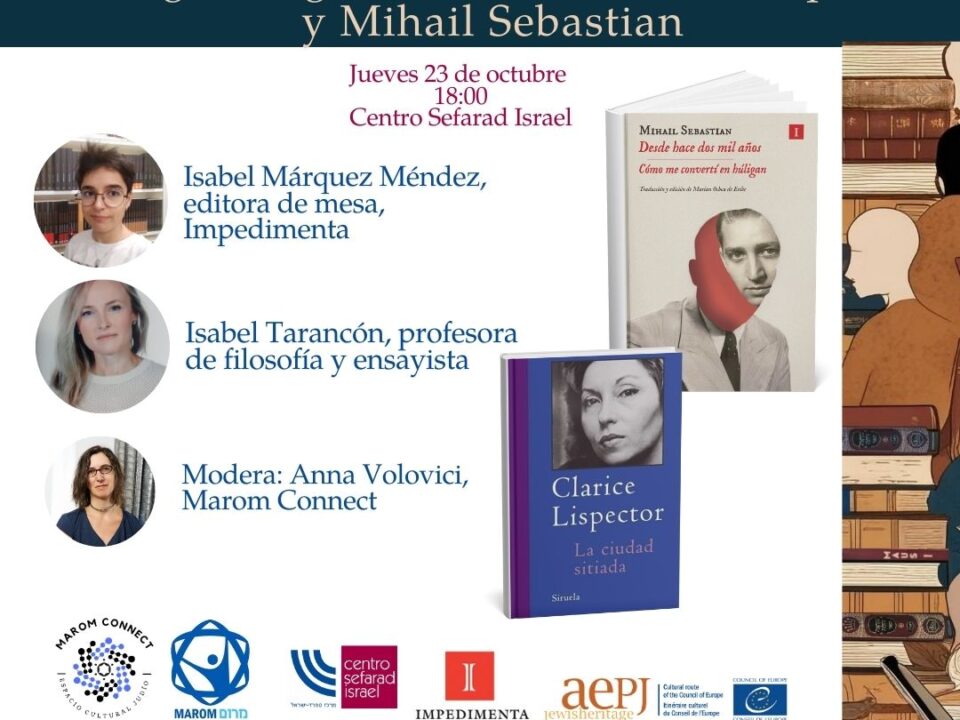 En el marco de las Jornadas Europeas de la Cultura Judía, dedicadas este año al tema El Pueblo del Libro, Marom Connect —plataforma cultural que difunde y conecta proyectos vinculados al judaísmo en español—, en colaboración con la AEPJ (European Association for the Preservation and Promotion of Jewish Culture and Heritage), invita a una tarde literaria en torno a dos autores esenciales: Mihail Sebastian y Clarice Lispector.