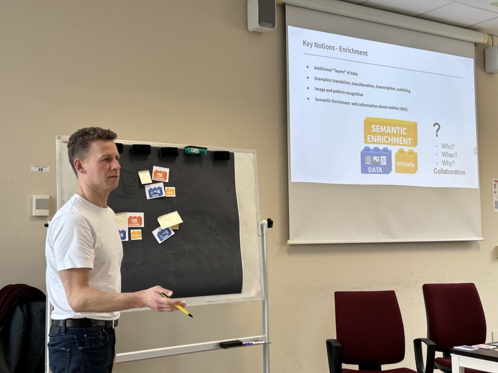 The main workshop opened with an hour-long presentation offering a deliberately non-technical introduction to the architectures behind data spaces. Instead of relying on specialist terminology, the session used visual metaphors and examples familiar to heritage professionals to explain what a data space is, and how it differs from databases or portals; the core components such as data pods, governance frameworks, connectors, identity management, metadata or semantic enrichment; how cultural heritage institutions can participate in and benefit from a data space; and how rights, ethics, interoperability and long-term access become core design elements.